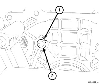 2. Install the plug (2) flush with the block boss face (1). The plug (2) is correctly installed when it is flush or protruding no more than 1 mm from the block boss face (1).