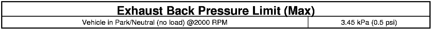 6. With transmission in Park or Neutral, raise engine speed to 2000 RPM. Monitor the pressure readings on the scan tool. Back pressure should not exceed specified limit. Refer to specification in table below EXHAUST BACK PRESSURE LIMITS.