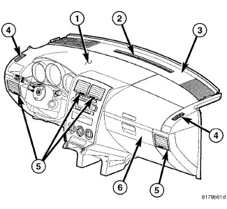 There are four rectangular instrument panel air outlets (5). One air outlet is located near each outboard end of the instrument panel facing the rear of the vehicle and two air outlets are located at the top of the instrument panel center bezel. Each of the instrument panel air outlets contain movable vanes that can direct or shut off the flow of the conditioned air leaving each of the instrument panel outlets. The driver and passenger side air instrument panel air outlets can be serviced separately. The center outlets are only serviced with the center bezel Instrument Panel Bezel - Removal.
