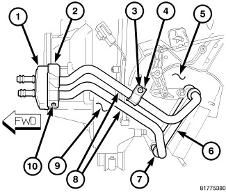5. Remove the screw (3) that secures the retaining bracket (4) for the heater core tubes (8) to the left side of the air distribution housing (5).