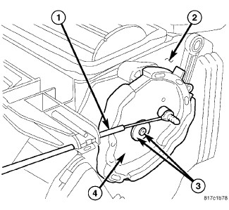 9. Install the blend door pivot lever (3) onto the end of the blend door pivot shaft (4) located on the left side of the air distribution housing (2). Make sure the lever retaining tab is fully engaged to the pivot shaft.