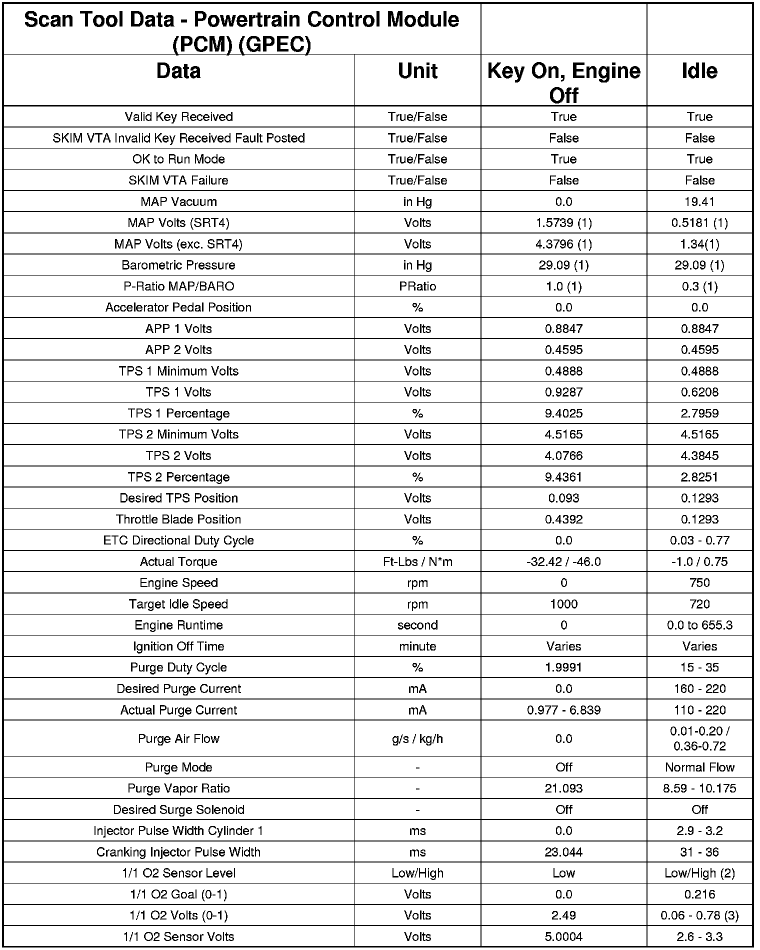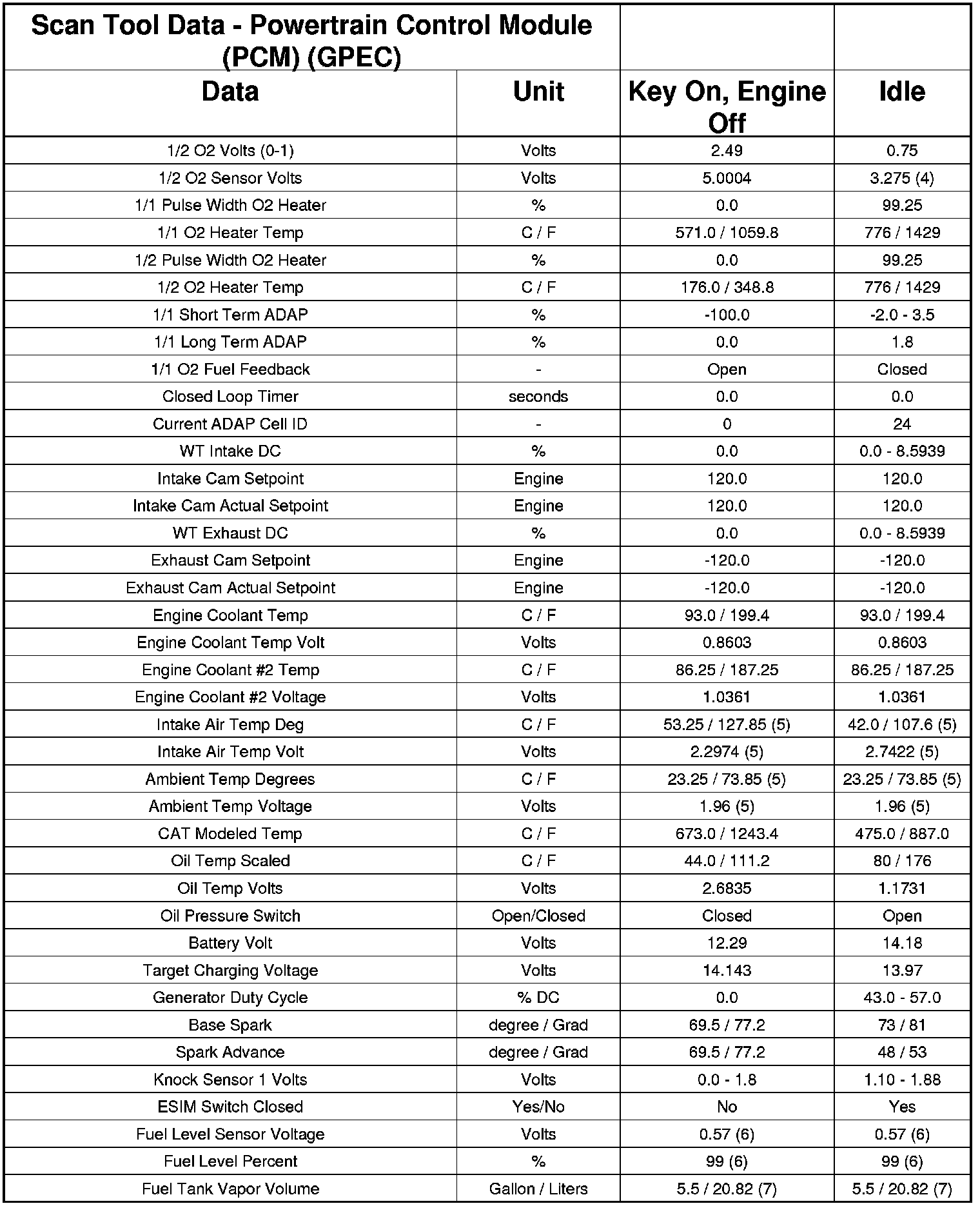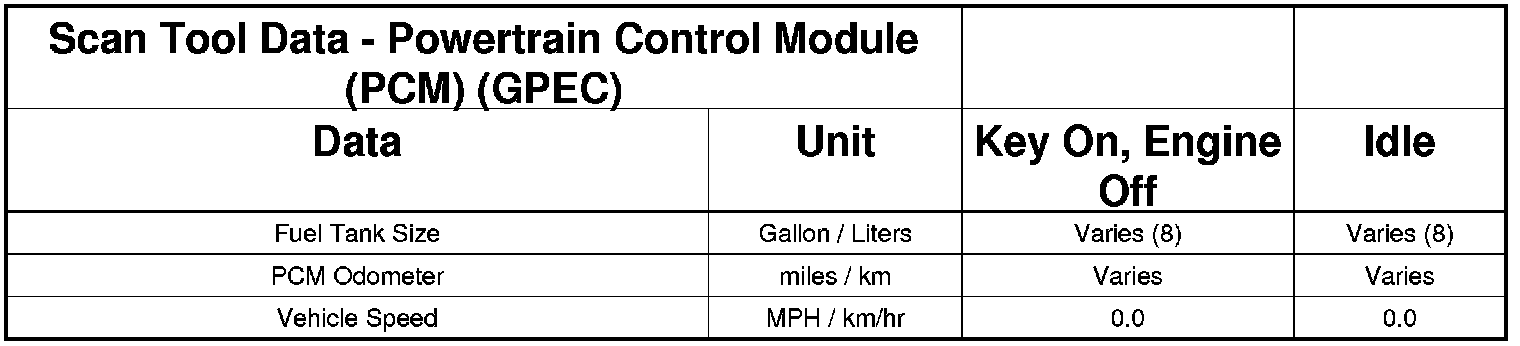 The following chart lists data values taken from the Scan Tool Powertrain Control Module (PCM) data list for the GPEC controller. The values were taken at key on, engine off and at idle. The data is to be used for reference only.
