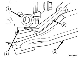 5. Remove the front bolt (2) attaching the lower control arm (3) to the front suspension crossmember (4).