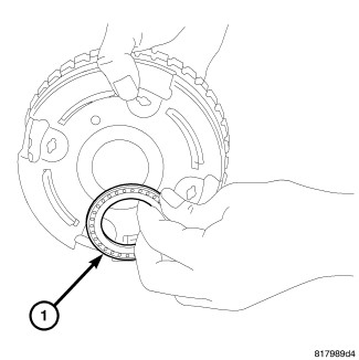 26. Expand the snap ring (1) and remove the driven sprocket (3), the oil pump chain (2), and the drive sprocket.