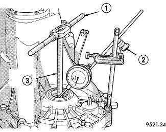 6. Apply a medium load to differential with Torque Tool C-4995A (3) and a T-handle (1), in the downward direction. Roll differential assembly back and forth a number of times. This will settle the bearings. Zero the dial indicator (2). To obtain end play readings, apply a medium load in an upward direction while rolling differential assembly back and forth. Record end play.