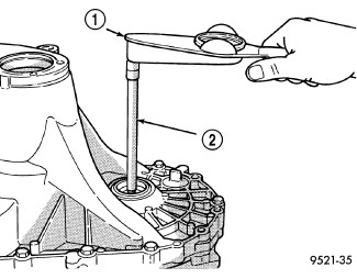 10. Using Torque Tool C-4995A (2) and an inch-pound torque wrenched (1) check turning torque of the differential assembly. The turning torque should be 6 to 12 in. lbs. If the turning torque is too high, install a 0.05 mm (0.002 inch) thinner shim. If the turning torque is too low, install a 0.05mm (0.002 inch) thicker shim.