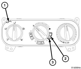 The switch for the rear window defogger (EBL) system (2) is located in the A/C-heater control (1) in the instrument panel center bezel. When the rear window defogger switch is pressed to the On position a request signal is sent to the cabin compartment node (CCN), which sends a message to the totally integrated power module (TIPM) to operate the EBL system.