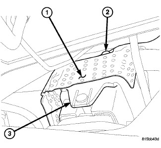 5. Install the heat shield (1) and the two heat shield mounting bolts (2).