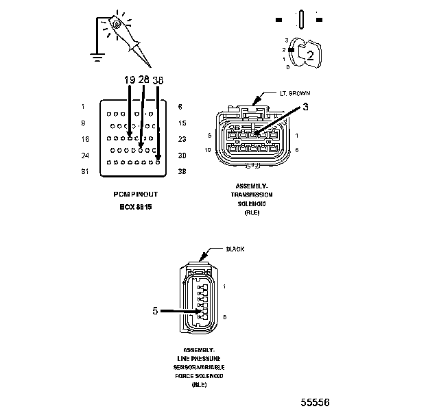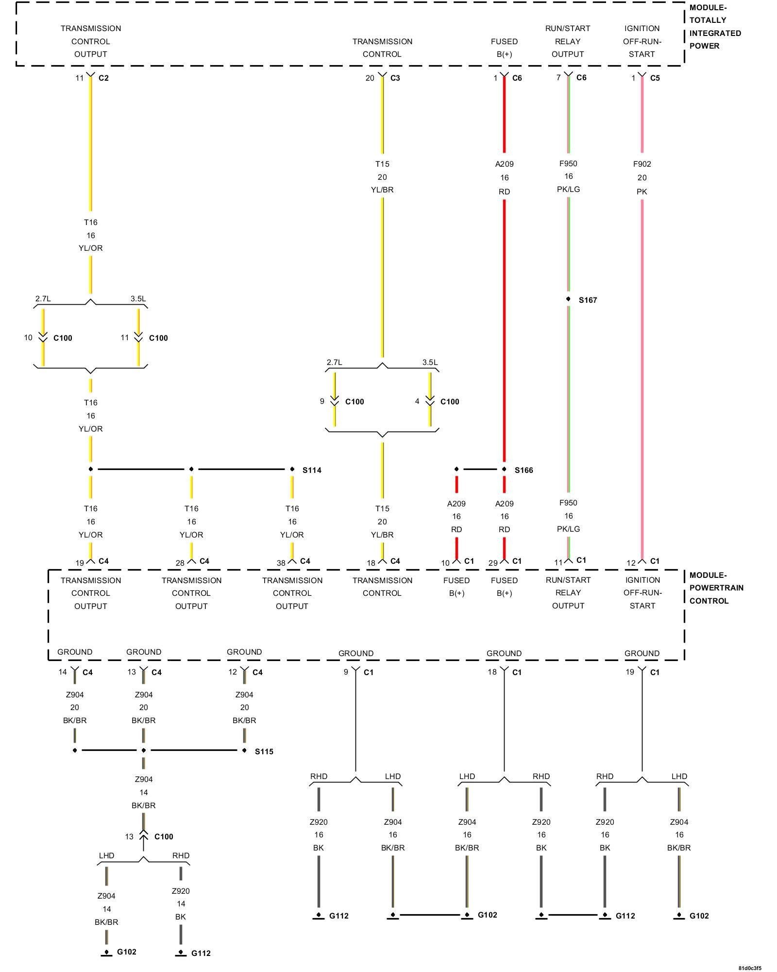 NOTE: The (T16) Transmission Control Output circuit branches off to both Transmission Solenoid/Pressure Switch Assembly, PCM and (if equipped) the Line Pressure Sensor/Variable Force Solenoid Assembly.