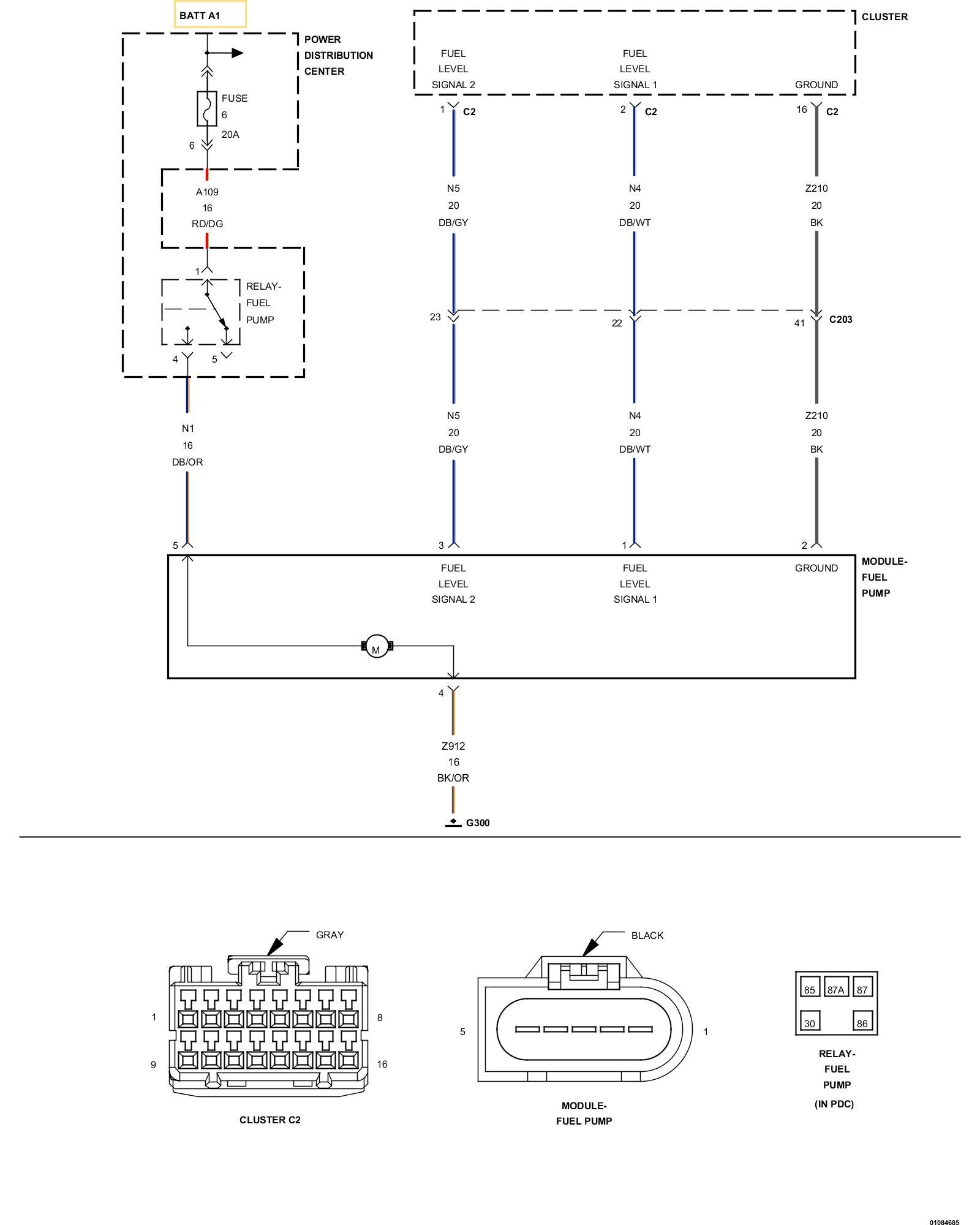 1. Using the wiring diagram/schematic as a guide, inspect the wiring and connectors between the Fuel Level Sensor 2 harness connector and the Cluster (CCN).