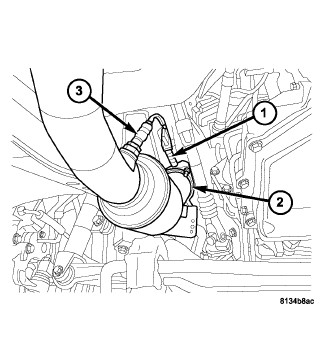 44. Connect the electrical connector (1) to the left downstream oxygen senor (3).