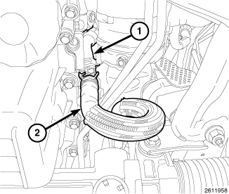 49. Connect the heater hose (2) to the oil cooler (if equipped) or to the engine coolant tube (1).