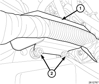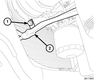 6. Install the wire harness support bracket (1) onto the upper most transmission bolts with two nuts (2). Tighten the nuts (2) to 21 Nm (15 ft. lbs.).