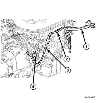 46. Install the ground strap (3) to the transmission mounting bolt. Tighten the nut to 21 Nm (15 ft. lbs.).