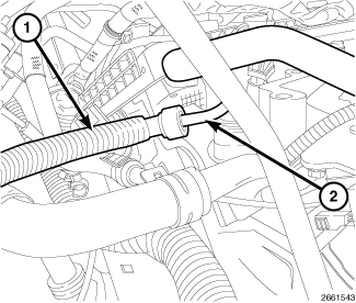 24. Connect the heater hose (1) to the extension pipe (2).
