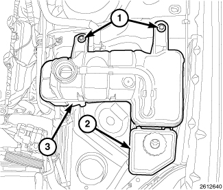20. Install the power steering reservoir (2) to the coolant reservoir (3) and engage the lock tab.