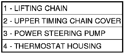 3. Connect an engine hoisting chain (1) to the engine lifting point on the left side of the rear timing cover (2) and the previously installed 8534B engine lifting bracket.