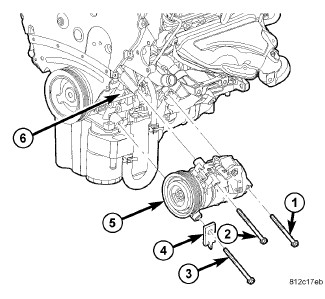 2. Loosely install the bolt (3) that secures the A/C compressor and automatic transmission cooler line bracket (4) (when equipped) to the compressor and position the compressor, bracket and bolt to the cylinder block (6).