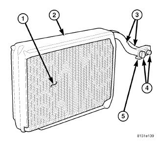 The A/C evaporator (1) for the heating-A/C system is located within the HVAC housing, behind the instrument panel. The A/C evaporator and its insulator (2) are positioned in the HVAC housing so that all air entering the housing must pass over the evaporator fins before it is distributed through the heating-A/C system ducts and outlets. However, air passing over the evaporator fins will only be conditioned when the A/C compressor is engaged and circulating refrigerant through the A/C evaporator.