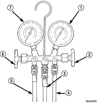 A manifold gauge set (1) may be needed with some recovery/recycling/charging equipment. The manifold gauge set should have manual shut-off valves (2 and 6), or automatic back-flow valves located at the service port connector end of the manifold gauge set hoses (4 and 5). This will prevent refrigerant from being released into the atmosphere.
