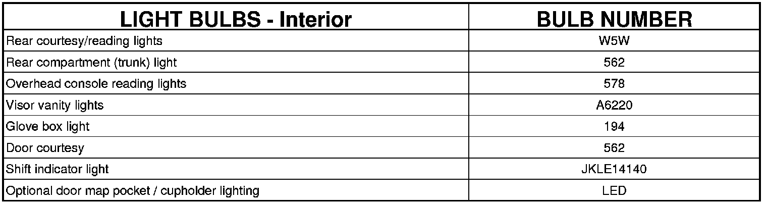 REPLACEMENT LIGHT BULBS - INTERIOR