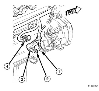 10. Remove bolt (1) from transmission cooler line clamp at right crossmember (3) and reposition transmission cooler line (2).