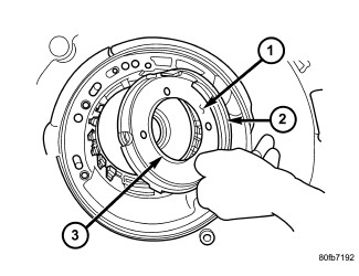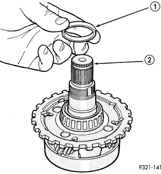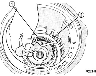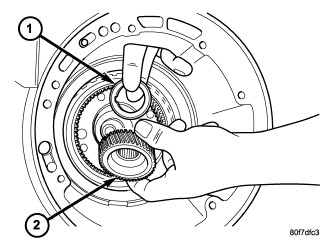 37. Install the #7 needle bearing (1) to the rear sun gear (2). The number 7 needle bearing has three anti-reversal tabs and is common with the number 5 and number 2 position. The orientation should allow the bearing to seat flat against the rear sun gear. A small amount of petrolatum can be used to hold the bearing to the rear sun gear.