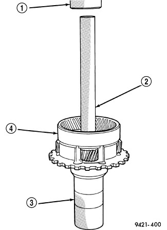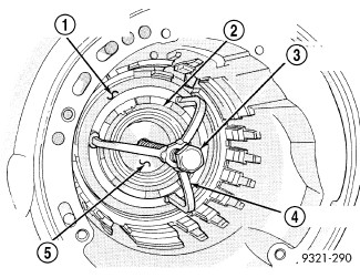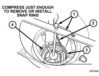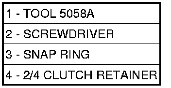 NOTE: Verify that Compressor Tool 5058A (1) is centered properly over the 2/4 clutch retainer (4) before compressing. If necessary, fasten the Compressor Tool 5058A bar to the bellhousing flange with any combination of locking pliers and bolts to center the tool properly.