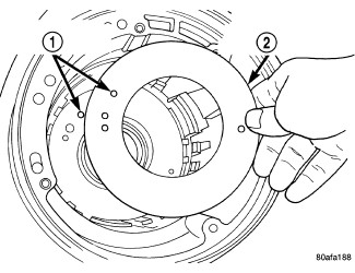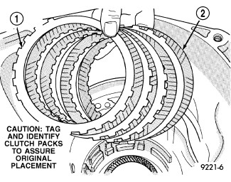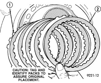 23. Install low/reverse clutch pack (1, 2). Leave uppermost disc out to facilitate snap ring installation.