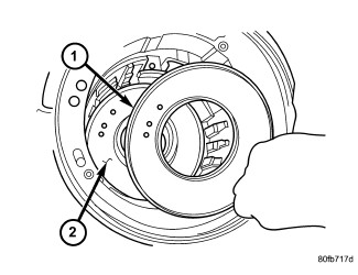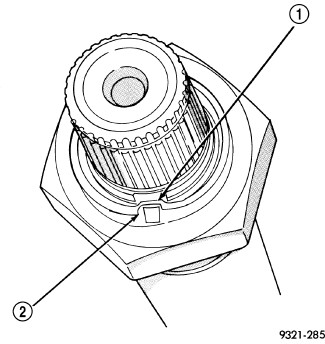 17. Install shim (1) on output shaft (2). Apply small amount of petrolatum onto the shim to hold it in place. Use the original shim as a starting point. If original shim is not available, use the thickest shim available.