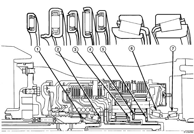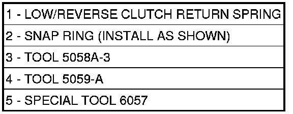 11. Install and load low/reverse spring compressor tool (3, 4, 5) as shown to facilitate snap ring (2) installation.