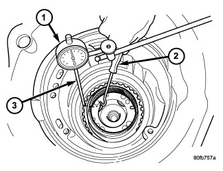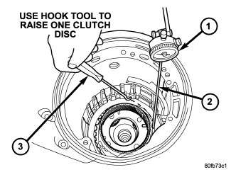 36. Measure 2/4 clutch clearance: Set up dial indicator (1) as shown. Press down clutch pack with finger and zero dial indicator. Record measurement in four (4) places and take average reading. The 2/4 clutch pack clearance is 0.76 to 2.64 mm (0.030 to 0.104 inch). If not within specifications, the clutch is not assembled properly or is excessively worn. There is no adjustment for the 2/4 clutch clearance.