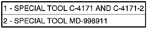 18. Install output shaft/rear carrier into rear bearing. The shaft must be pressed into position. Use special tool MD-998911 (Disc) (2) and C-4171 and C-4171-2 (Handle) (1) to press shaft into rear bearing.
