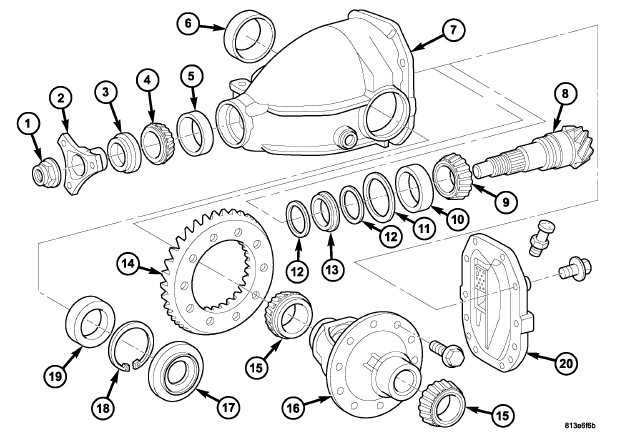 The 198 MM RII (Rear-Independent-Iron) axle is an independent assembly with a cast iron housing and differential. The 198 MM RII uses an open differential which is supported by two tapered roller bearings located on either side of the case. Differential bearing preload and ring gear backlash are controlled with select snap-rings located on the outside of the differential bearing cups. Pinion height is set with a select shim located under the rear pinion bearing cup.