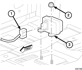 1. Install dynamics sensor (3) over studs mounted to floor pan tunnel (4).