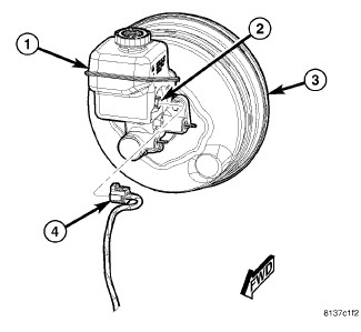 The brake fluid level sensor (2) is an integral part of the master cylinder fluid reservoir (1).