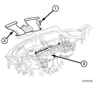 1. Position the defroster duct (2) onto the top of the HVAC air distribution housing (3).
