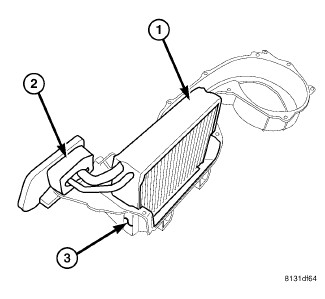 3. Carefully lift the A/C evaporator and the foam seal (2) out of the lower half of the HVAC housing (3).