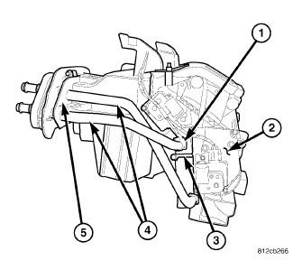 The heater core (1) is mounted into the driver side of HVAC air distribution housing (2), located behind the instrument panel. The heater core is a heat exchanger made of rows of tubes and fins and is secured to the air distribution housing by a plastic retaining bracket (3). The heater core tubes (4) are secured to the HVAC housing by a removable flange (5).