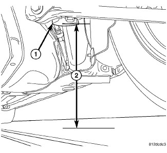 2. Rear - On each side of the vehicle, measure the distance (2) from the travel limiter (1) attached to the front rear crossmember mount bushing to the floor or alignment rack/lift runway surface. It may be necessary to measure to the bottom of a straight edge, placed from lift runway to runway, to get an accurate measurement.