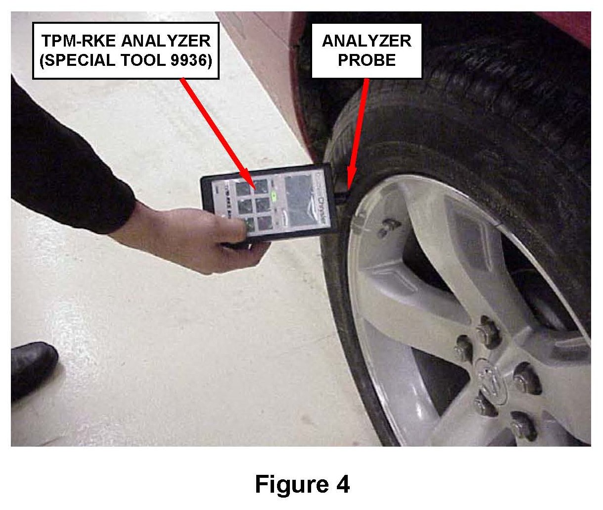 g. Place the probe end of the analyzer by the valve stem of the wheel and press the green "TEST" button to scan the tire pressure sensor (Figure 4). Do not move the analyzer until the green pass light illuminates.