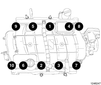 Intake manifold bolts (with thread lock patch) and tighten to 12 Nm (105 in. lbs.) in the sequence shown.