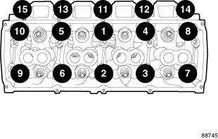 Tighten the cylinder head bolts 11 through 15 to 34 Nm (25 ft. lbs.) using the sequence shown.