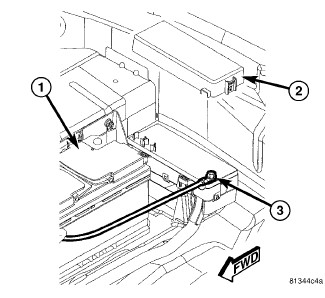 12. Install the battery positive cable to rear Power Distribution Center (PDC) fastener (3).