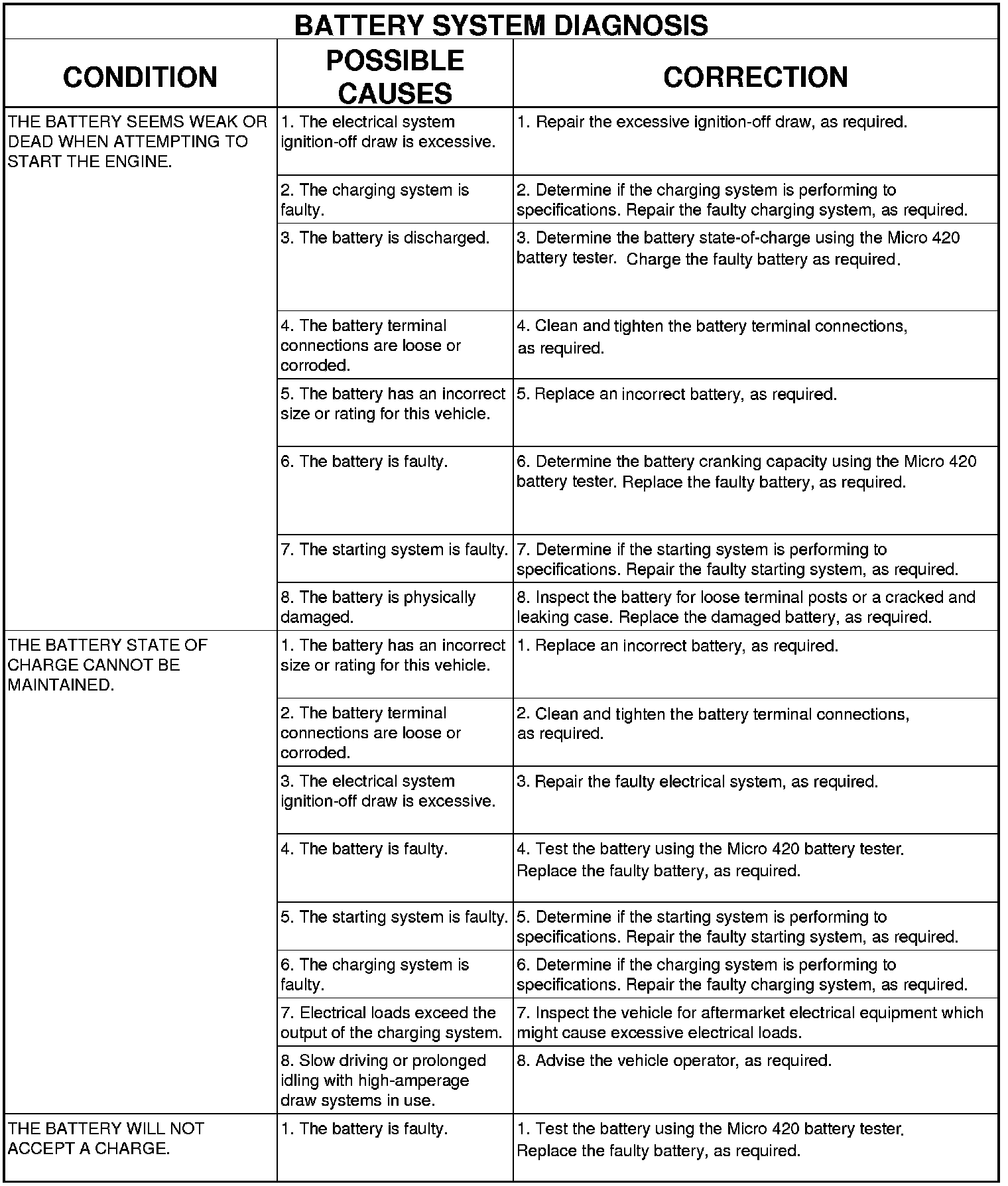 The battery, starting, and charging systems in the vehicle operate with one another and must be tested as a complete system. In order for the engine to start and the battery to maintain its charge properly, all of the components that are used in these systems must perform within specifications. It is important that the battery, starting, and charging systems be thoroughly tested and inspected any time a battery needs to be charged or replaced. The cause of abnormal battery discharge, overcharging or early battery failure must be diagnosed and corrected before a battery is replaced and before a vehicle is returned to service. The service information for these systems has been separated within this service manual to make it easier to locate the specific information you are seeking. However, when attempting to diagnose any of these systems, it is important that you keep their interdependency in mind.
