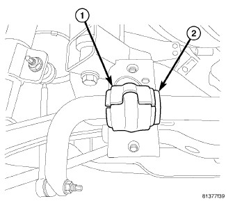 13. Utilizing slit in bushing, install stabilizer bar bushing (1) against locating collar on stabilizer bar (2) as shown. Make sure slit in bushing is positioned toward rear of vehicle.