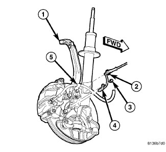 5. Attach wheel speed sensor cable and routing clip (2) to brake flex hose routing bracket (5).