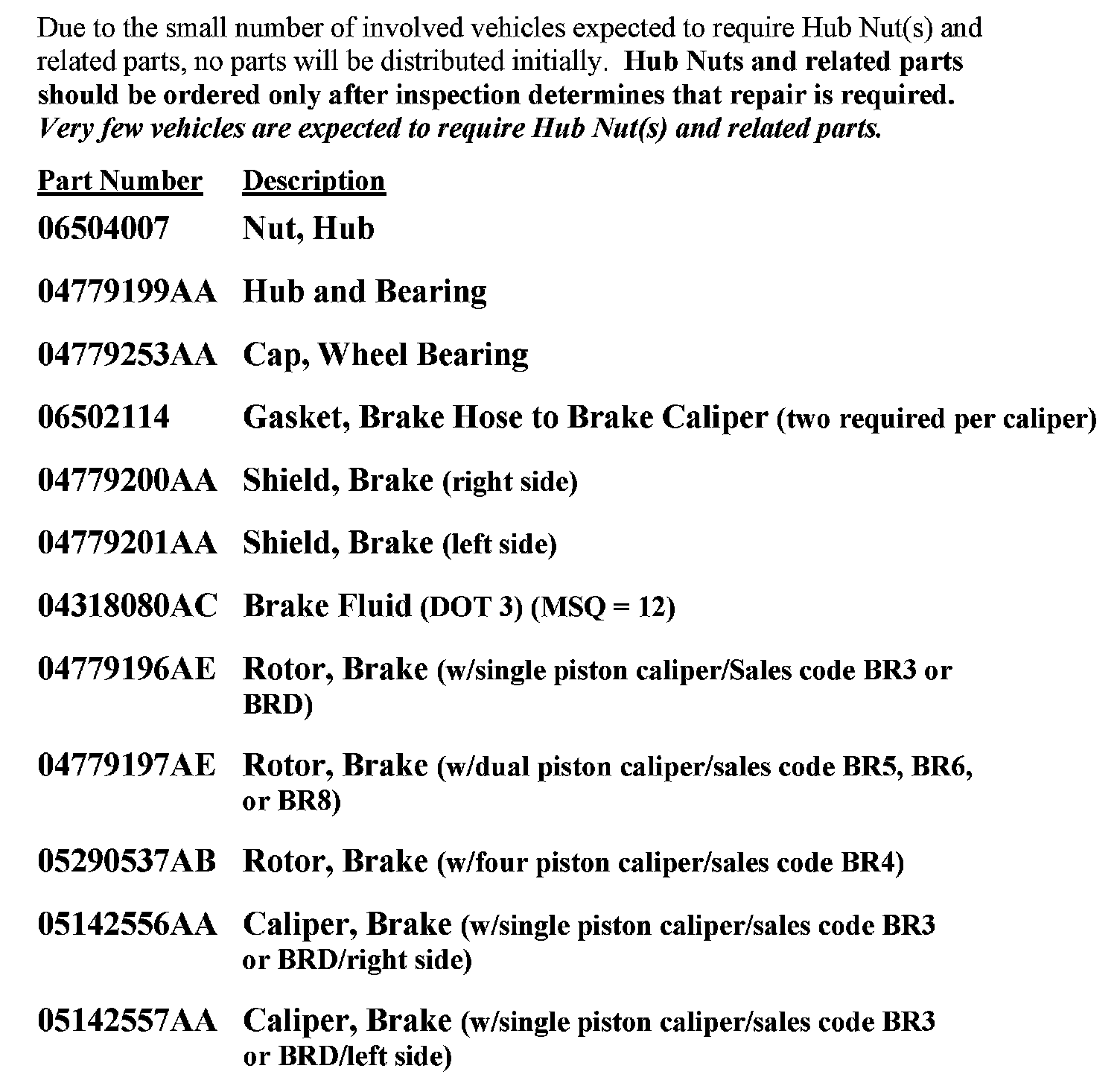 The front wheel hubs must be inspected for looseness. Vehicles found with loose front hub(s) must have the hub (w/bearing), hub nut, brake caliper, brake caliper guide pins, brake caliper adapter, brake pads, brake shield, and brake rotor replaced.