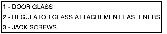 3. With the glass (1) in the full up position, partially loosen the regulator glass clamp fasteners (2).