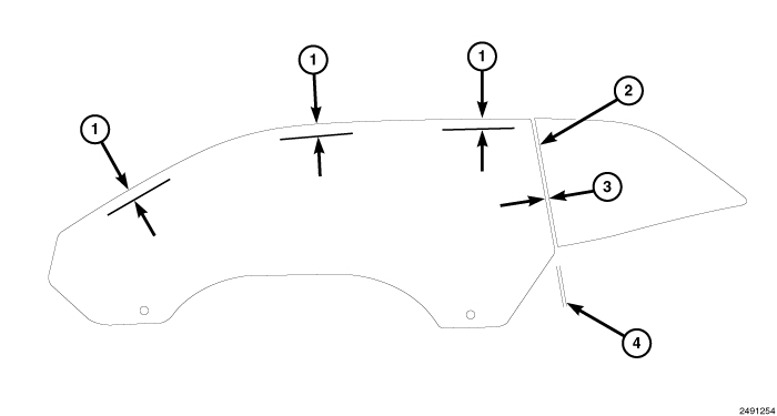 5. From the outside of the vehicle, with the door closed, use a suction cup or equivalent and simultaneously slide the glass to achieve the three minimum glass engagement tape marks (1) and the door glass to quarter glass gap (3) and parallel measurements (4).